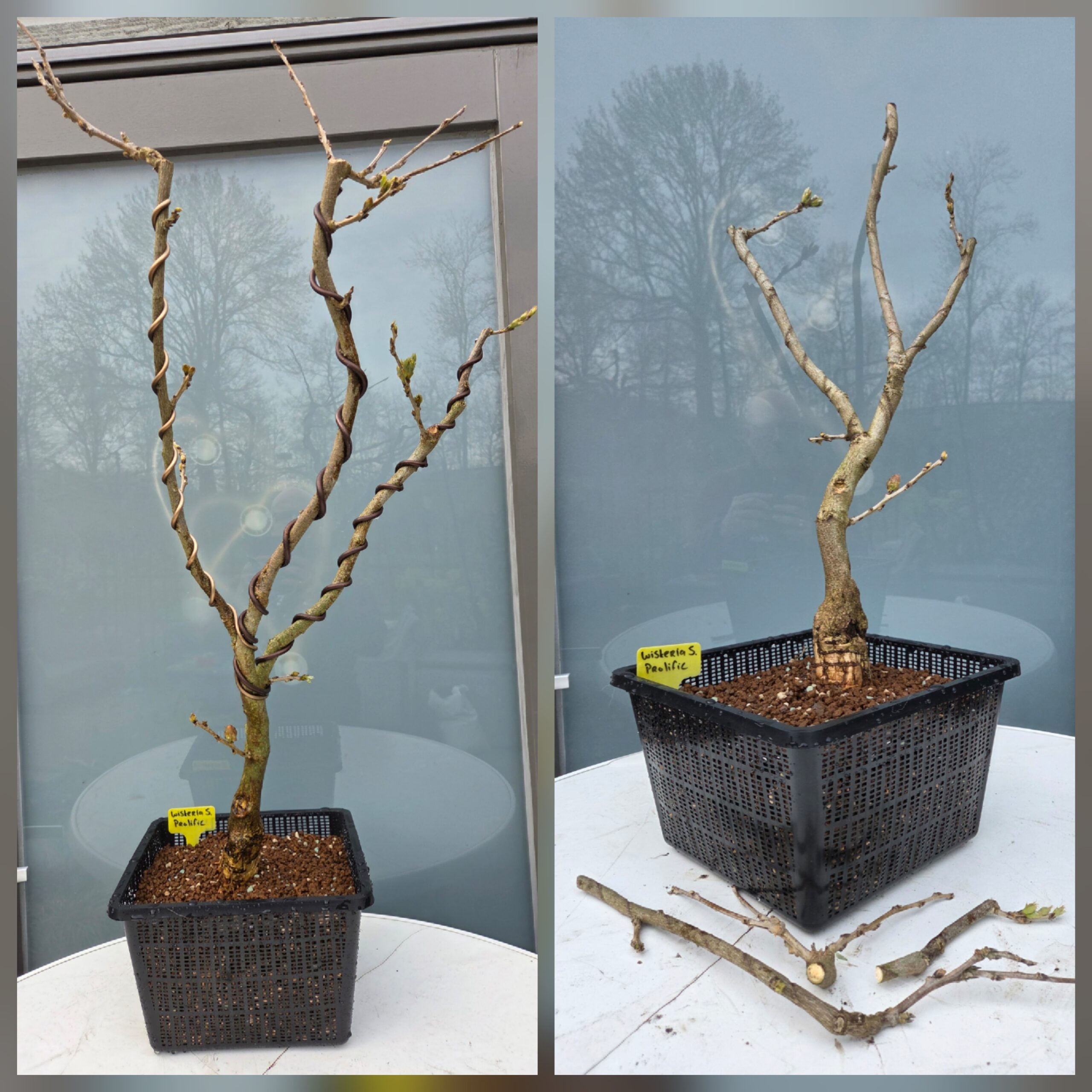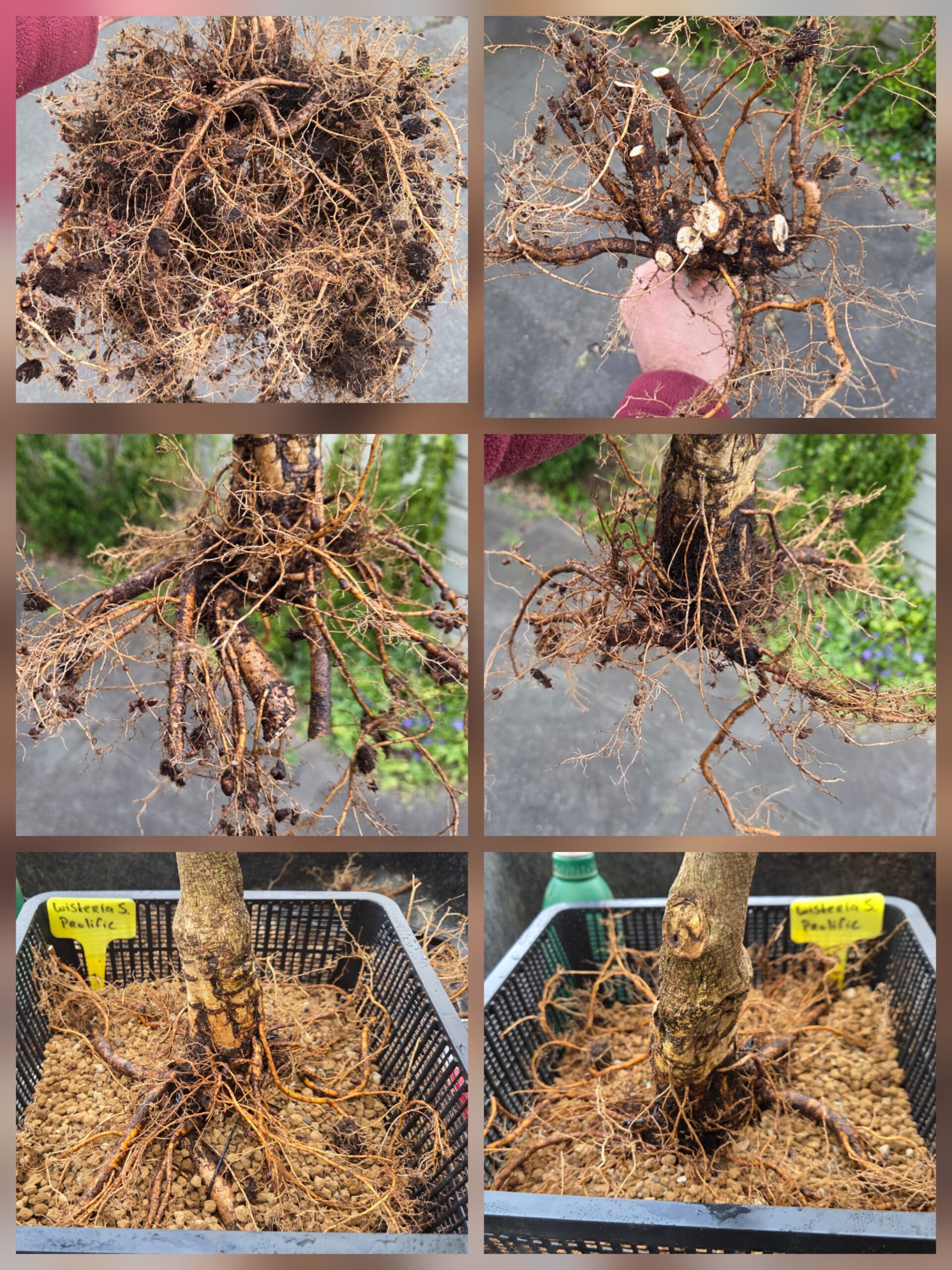 De bloemknoppen begonnen al op te zwellen dus hoog tijd om de Wisteria zijn eerste verpotting te geven. De pot was enorm doorworteld en de wortels waren een zooitje. Alle naar beneden groeiende en gekronkelde wortels weg genomen. De wortels groeiden helaas wel overwegend aan 1 kant. Hopen dat de andere kant nog wortels aan gaat maken. Toen ik het boompje in de vijvermand wilde zetten paste het nog niet, dus de overgebleven wortels nog wat korter gemaakt. Zoals zovaak, ook bij dit boompje weer teveel wortels naar mijn gevoel weggehaald. Fingers crossed.
