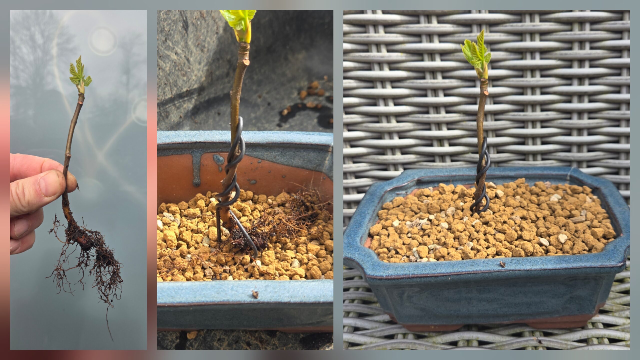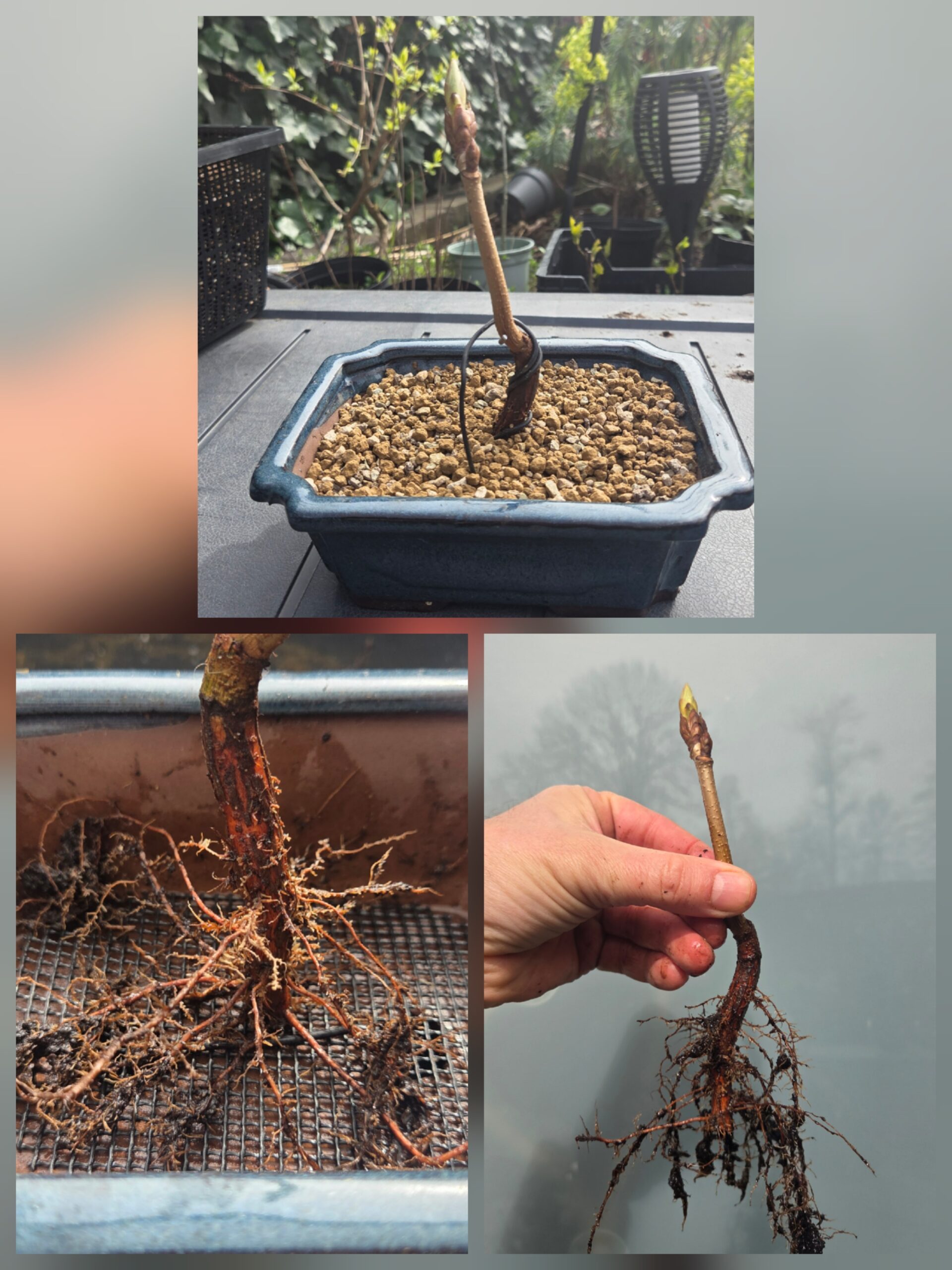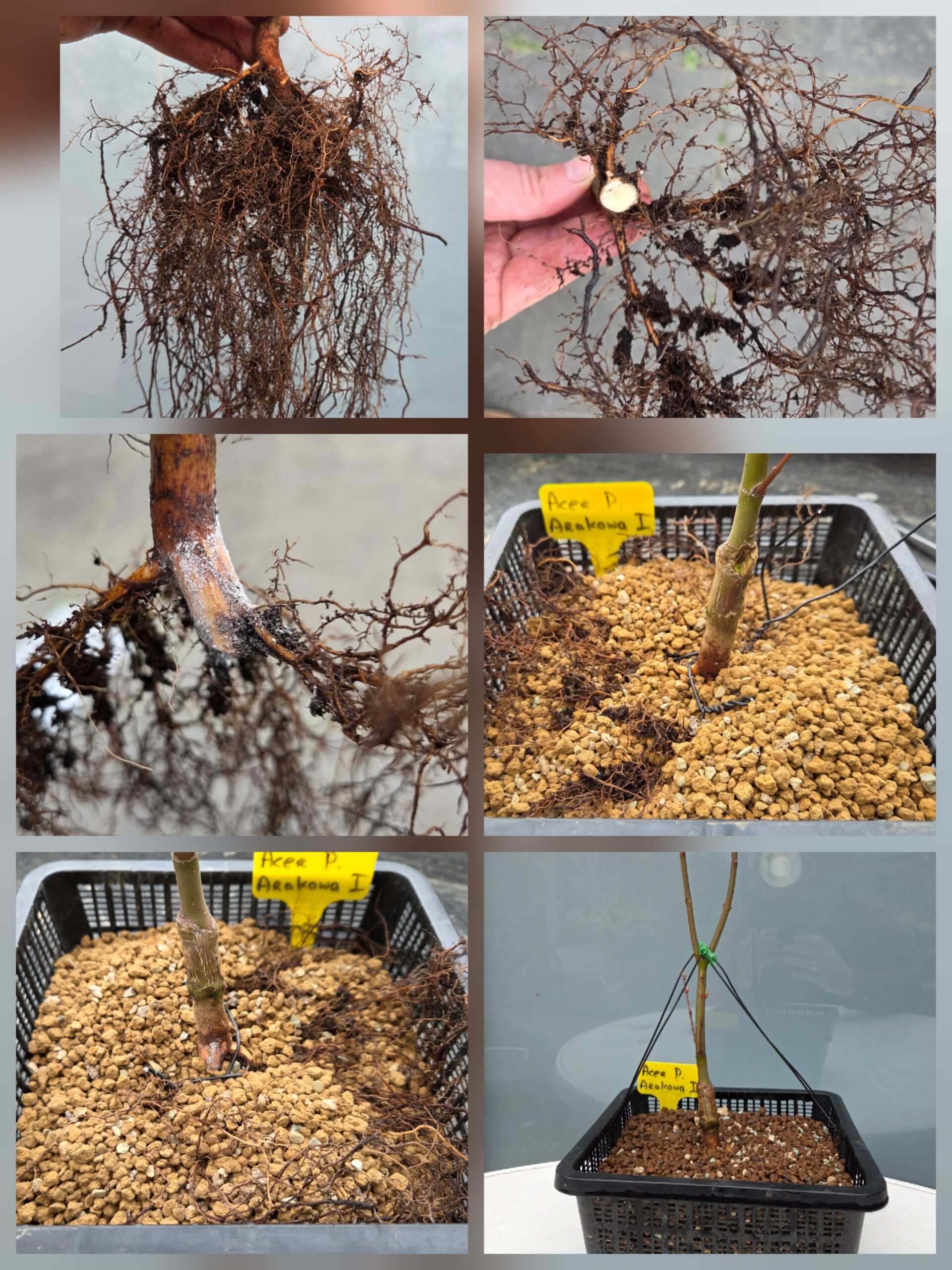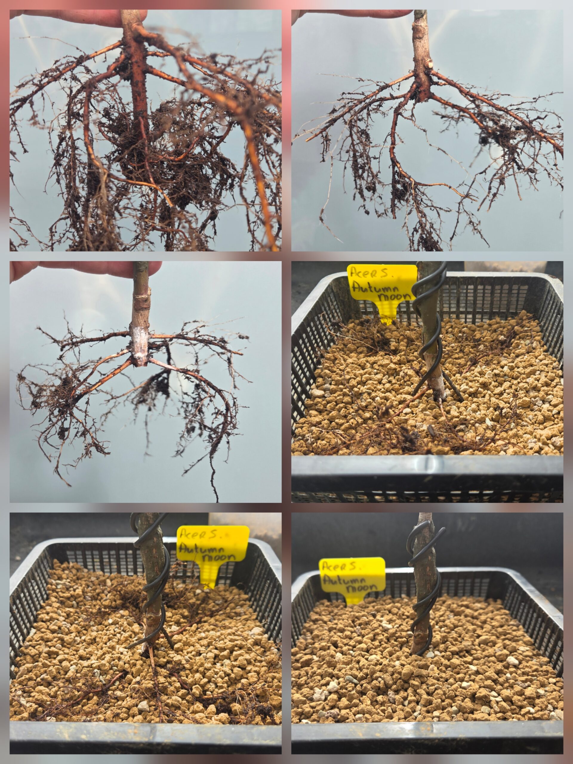 Op de eerste foto kan je goed zien wat ik bedoel met “wortels op meerdere niveaus”. De Acer heeft op 3 niveaus/hoogtes wortels. De onderste laag helemaal verwijderd en afgedicht met wondpasta. Aan de kant waar geen wortels zitten stekpoeder op het stammetje gesmeerd. Omdat de wortels nog dun zijn heb ik het boompje vastgezet met een corset.