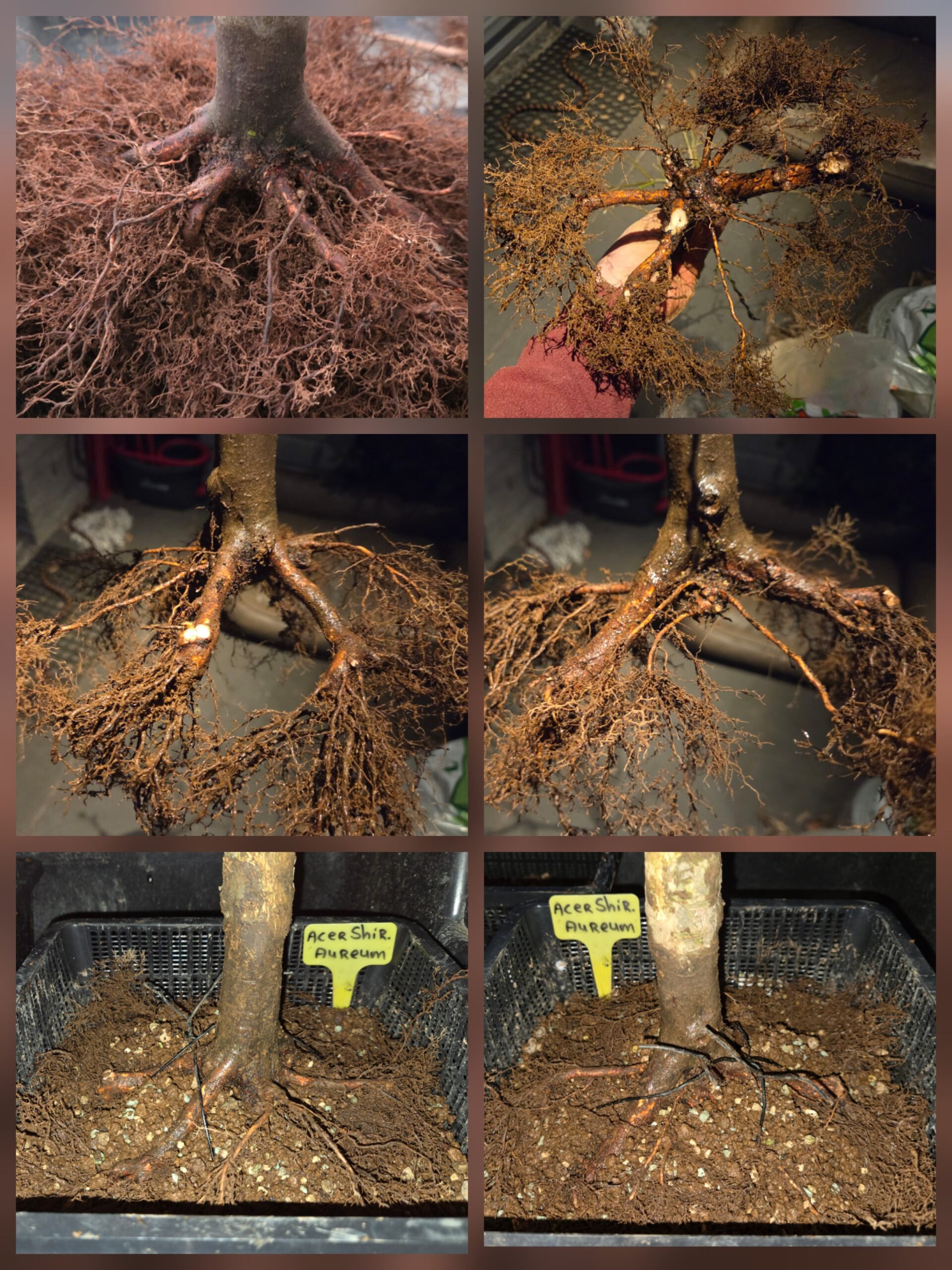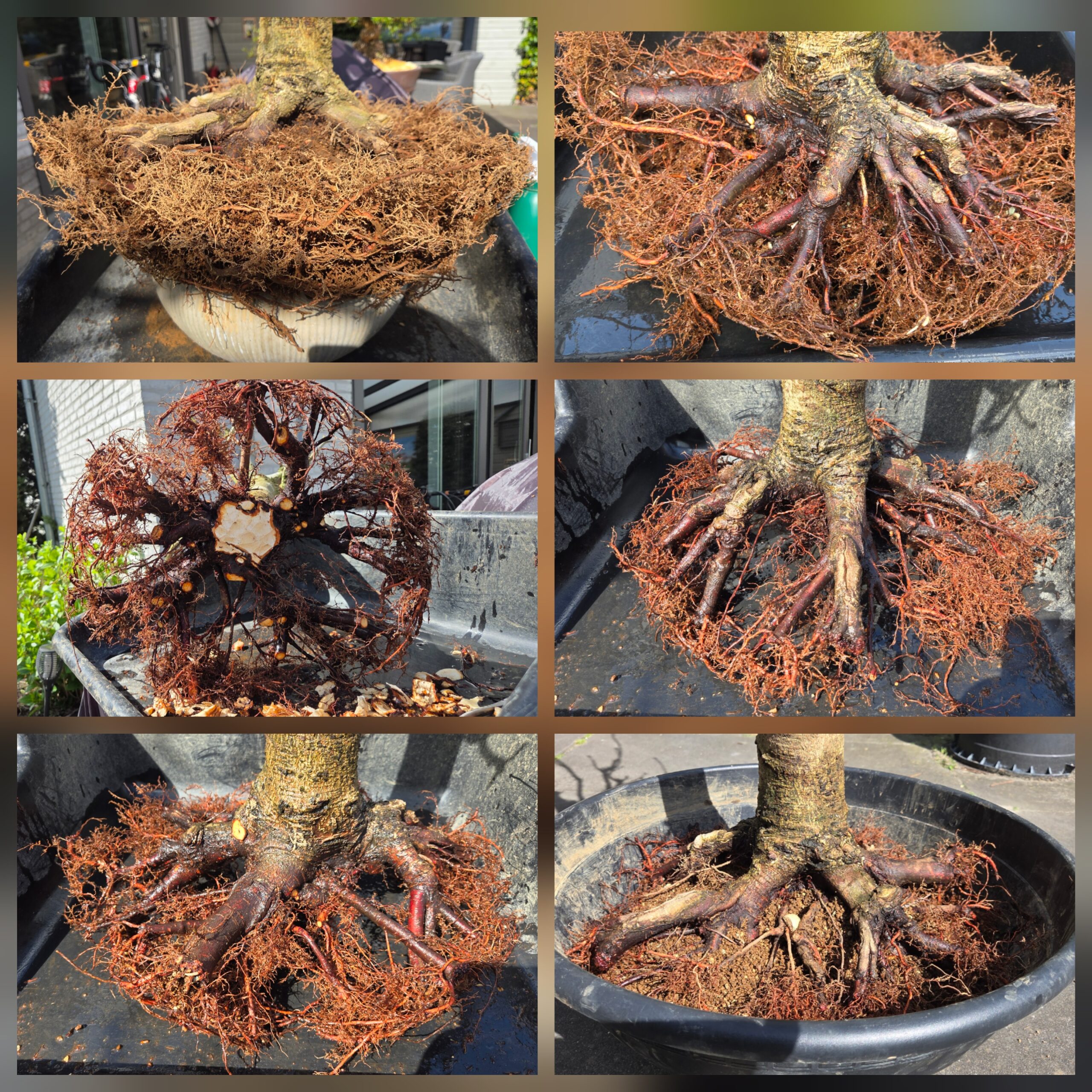 Niet normaal. Wat een wortelkluit heeft deze Acer in een jaar gevormd. Langzame groeier schijnt het te zijn, maar niet onder de grond. Ik wist niet waar ik moest beginnen met snoeien, maar als je foutje voor foutje wegsnoeit, krijg je steeds meer overzicht en eindig je uiteindelijk met nog maar een kwart van de wortels. Er zit een vrij lege plek tussen 2 dominante wortels. Er groeien wel 3 dunne worteltjes tussen, dus ik hoop dat die zich gaan ontwikkelen. Volgend jaar kan deze Acer wellicht in een bonsaischaal.