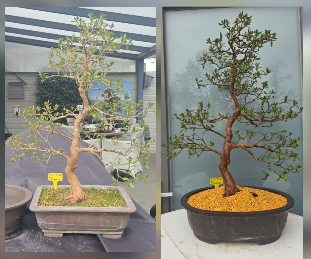 De wortelkluit los en wat kleiner gemaakt en in verse Kanuma gezet. De bloemknoppen had ik er vorige week al weg genomen. Over 2 weken bemesten en dan kan hij dit seizoen goed aansterken.