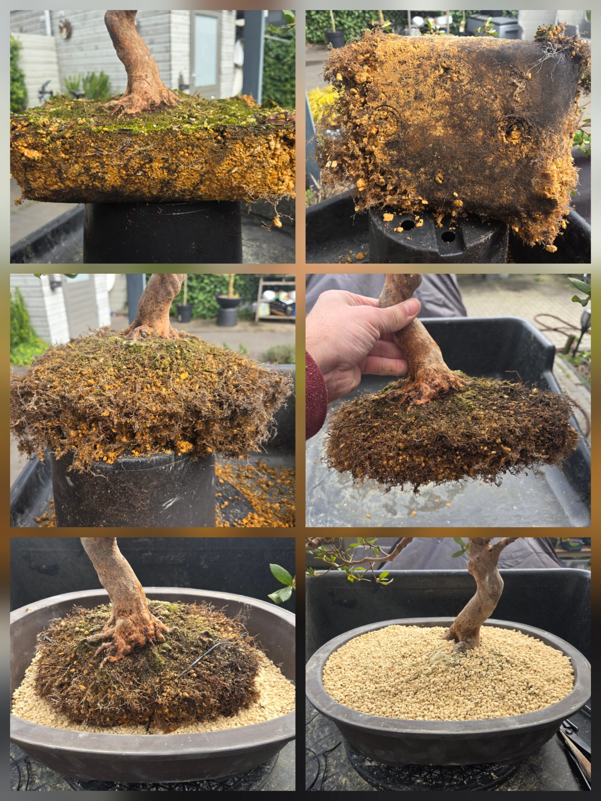 De Arakawa verpot vandaag. Op 3 niveaus wortels. De onderste heb ik eraf gesnoeid. De 2e laag durfde ik niet aan omdat er anders te weinig wortel over zou blijven. Aan 1 kant van de stam totaal geen wortels dus heb ik als experiment de bast een beetje beschadigd met mijn nagel en stekpoeder erop gedaan. Volgend jaar kijken of dat gelukt is.