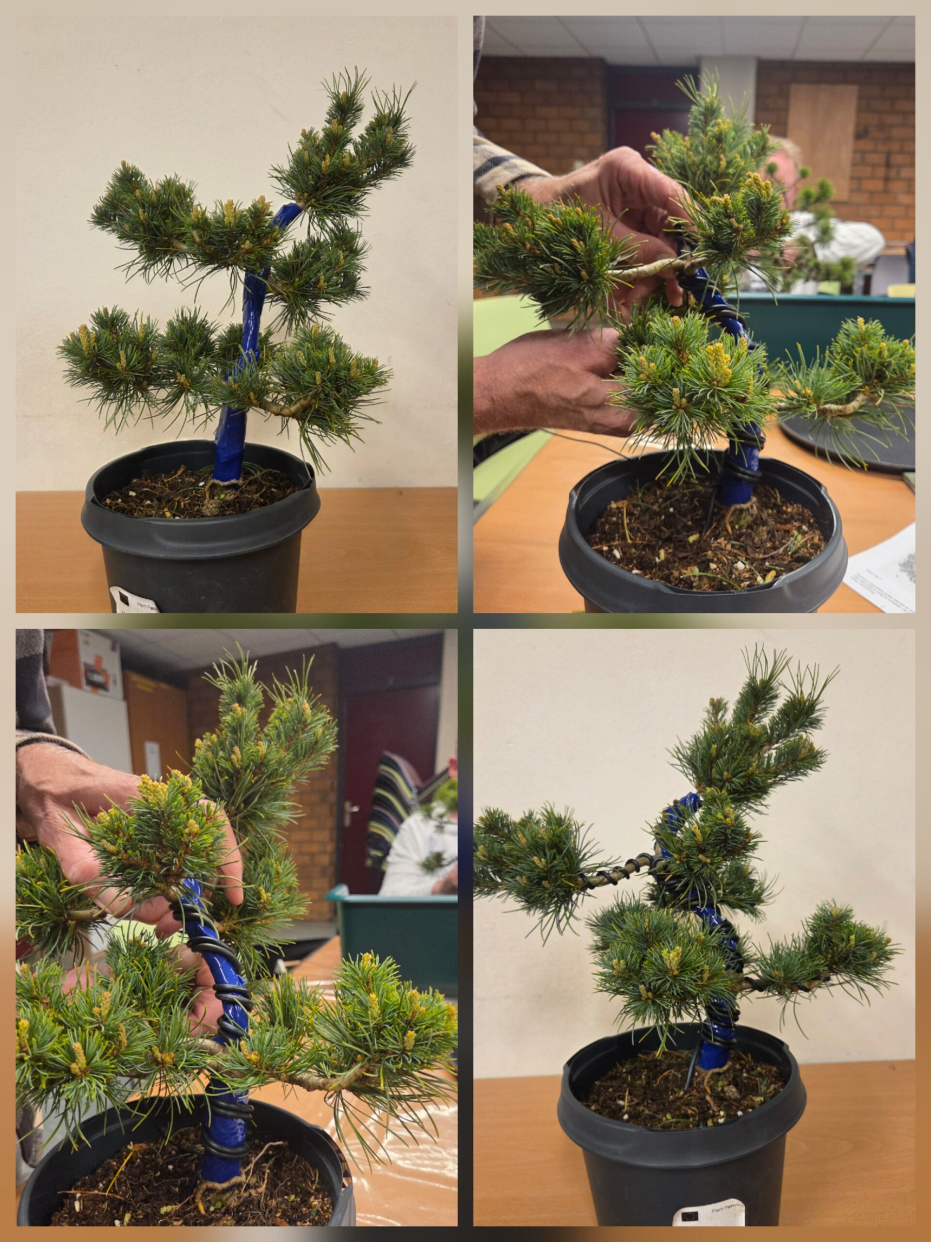 Met hulp van Tom deze Witte Den bedraad en de stam zo gebogen dat de karaktertak op een buitenbocht zit. In het najaar kan gesnoeid worden. In een jaar is dit boompje veel ontwikkeld.