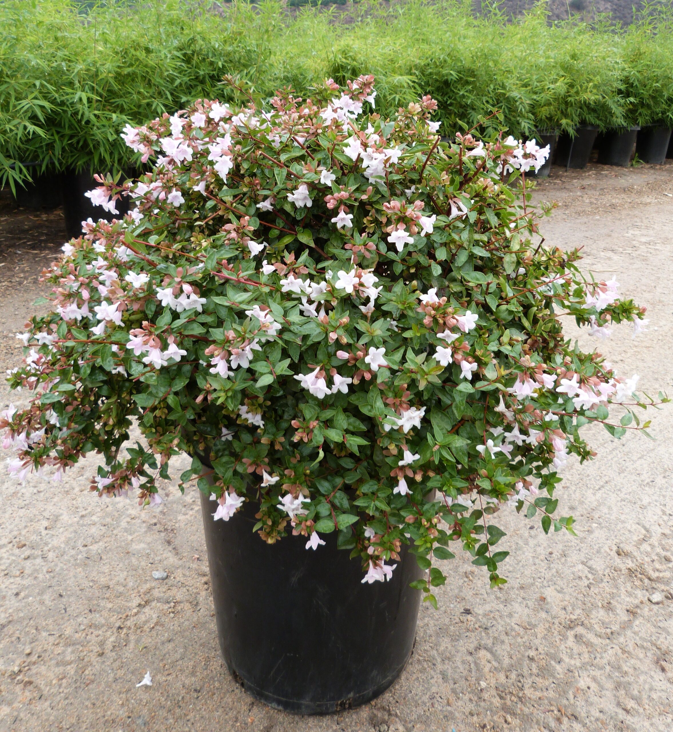 Abelia grandiflora is een populaire, halfwintergroene sierheester bekend om zijn weelderige, langdurige bloei van witroze, geurende, trompetvormige bloemen (juni-oktober) en glanzend, donkergroen blad dat in de herfst brons/rood kleurt. Deze sierlijke struik groeit bossig en uitgespreid (tot ~150 cm), is aantrekkelijk voor bijen, en verkiest een zonnige, beschutte plek met goed doorlatende grond. De plant is redelijk winterhard, maar kan bescherming nodig hebben bij strenge vorst