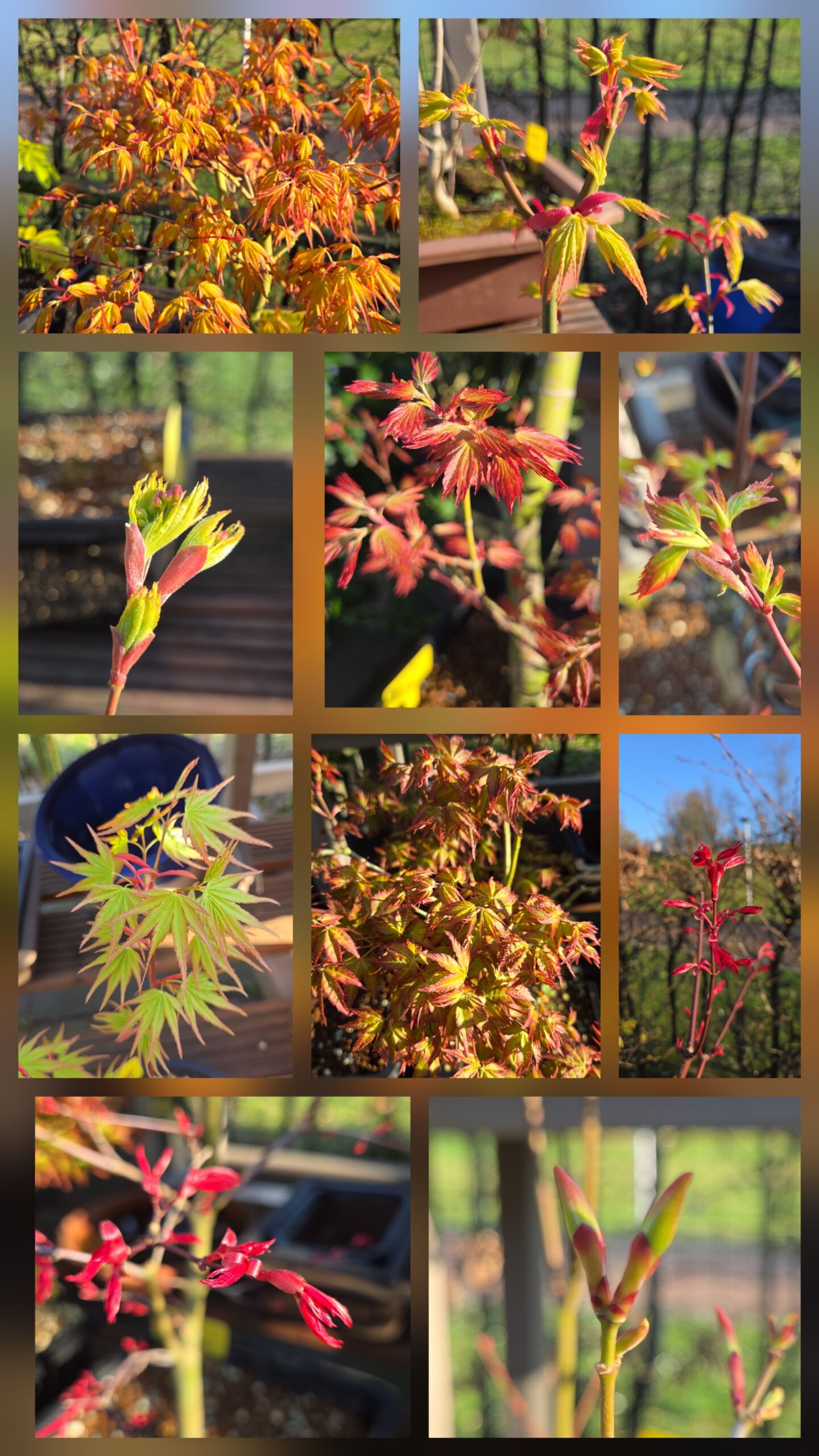 In deze collage is goed te zien dat elke Acer zijn eigen schema volgt. De één staat vroeger in blad dan de ander. Van linksboven naar rechtsonder:
