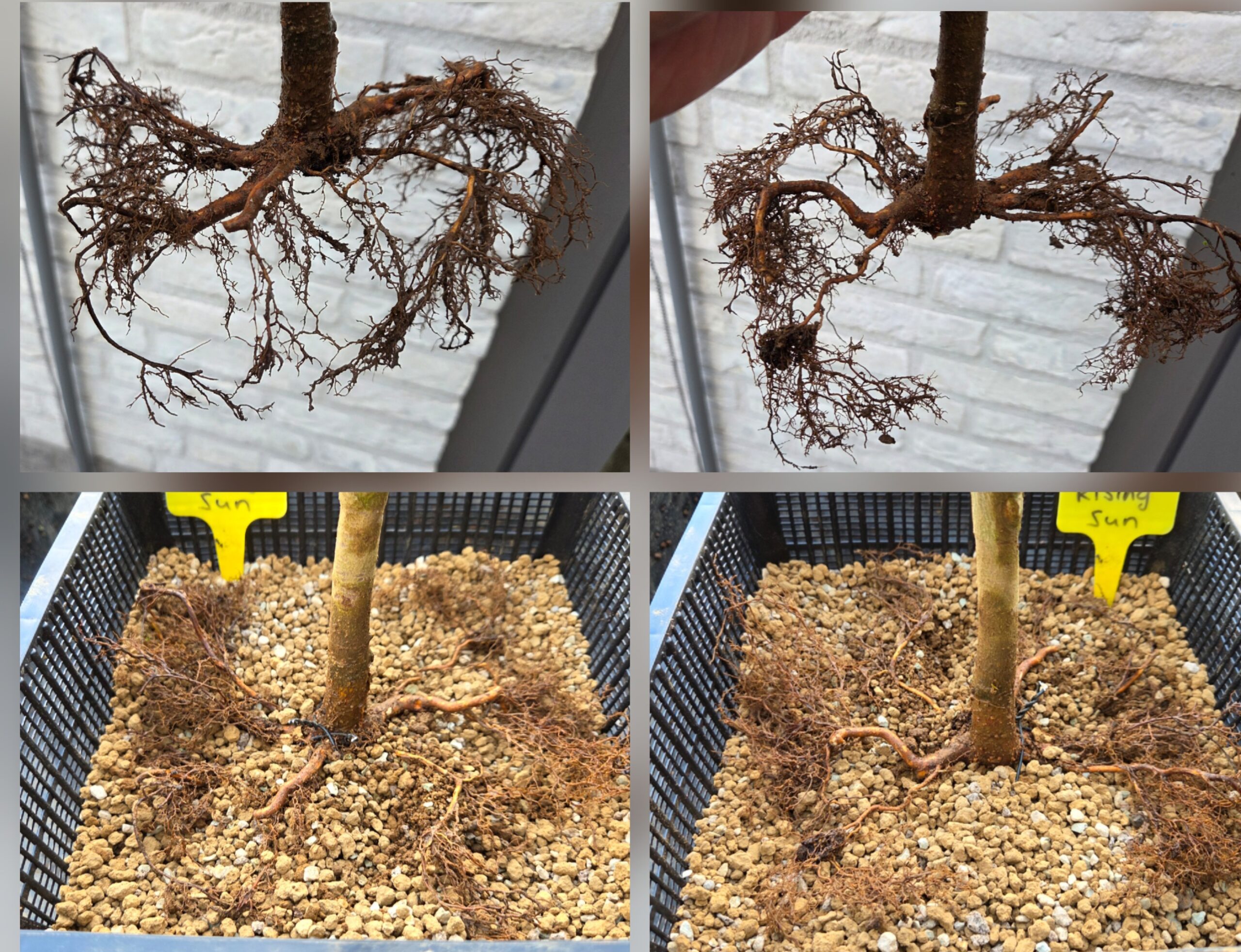 De wortelvoet is een zooitje. De wortels zijn gedraaid en gekruld. Zo goed mogelijk correcties gemaakt en in de vijvermand gepot. Volgend jaar verder werken aan de wortelvoet. Eerst maar even goed op sterkte komen aankomend jaar.
