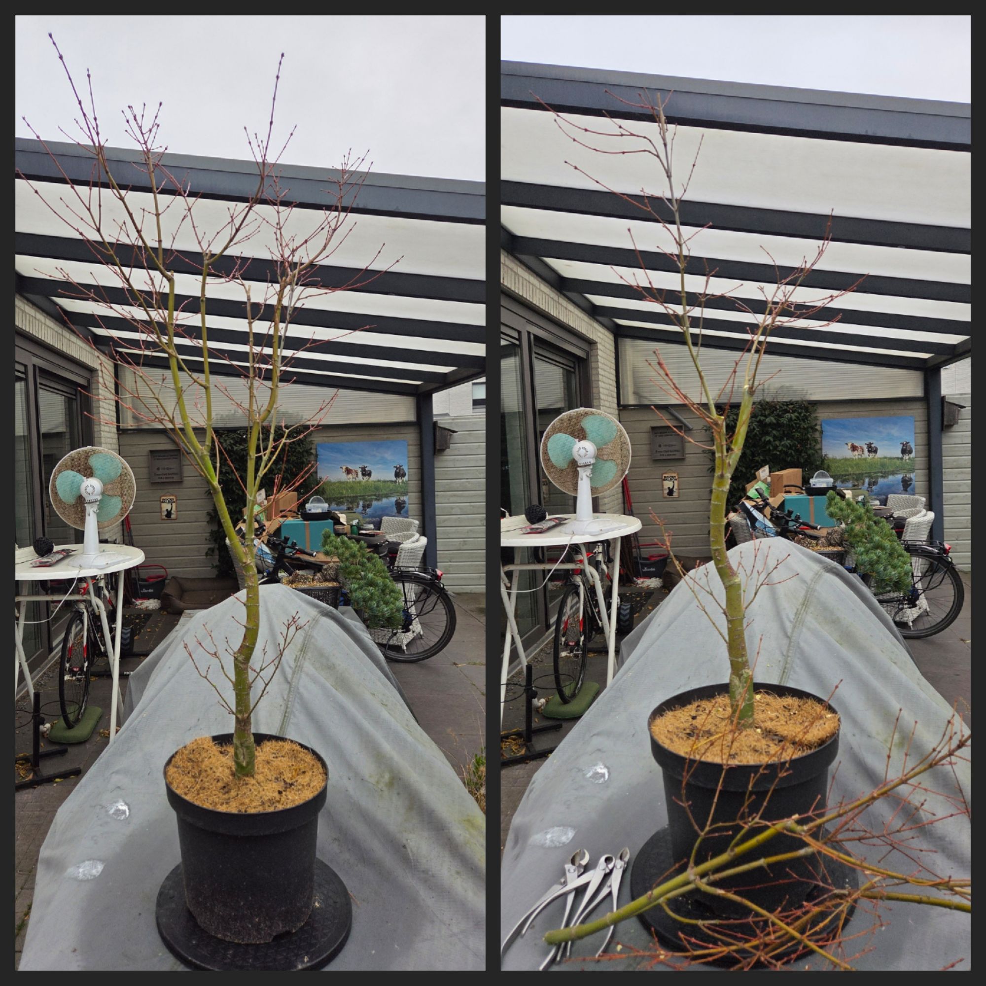 De acer een flinke snoeibeurt gegeven met hulp van Paula. Twee grote takken die het model van de boom verstoorden, eruit geknipt. 1 tak was een tussentak. Deze tussen twee zijtakken uit gesnoeid als een V-tje.
