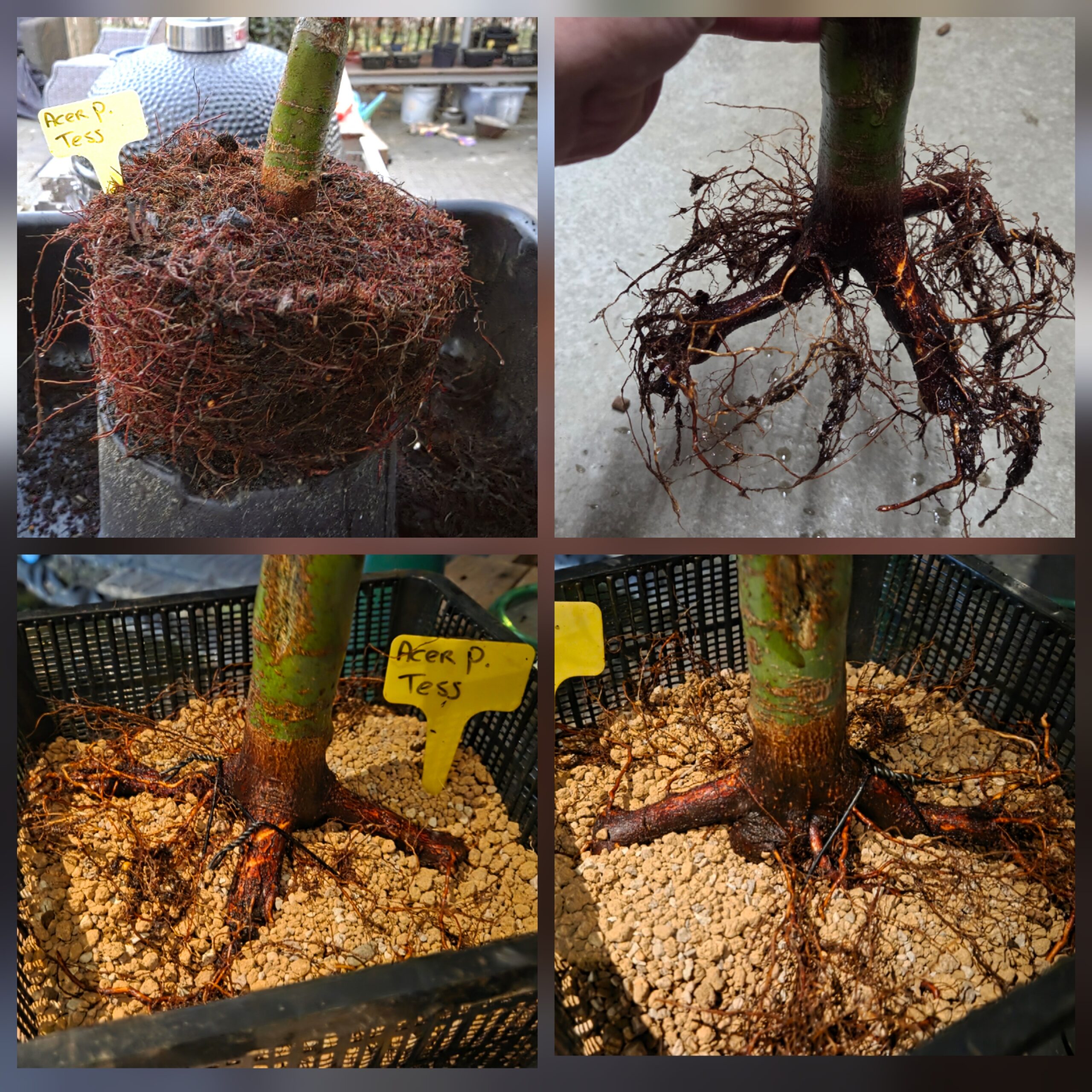 Mijn moeilijkste verpotting ooit. Ik had deze prachtige Tess al wat groter gekocht. Bij de kweker heeft hij een tijd in een ronde container gestaan. De wortels waren dan ook in de pot gecirceld, zowel boven als onder de hoofdwortels. Uiteindelijk maar de zaag erin gezet en de onderste 5 cm eraf gezaagd en vanaf daar weer verder gegaan. Zelfs de tuinslang moest ik gebruiken. Na veel geploeter had ik eindelijk de wortels vrij en kwam er nog een redelijke wortelvoet tevoorschijn. Niet aan alle kanten. Achter zat geen dikke wortel. Nu hopen dat hij goed aanslaat.