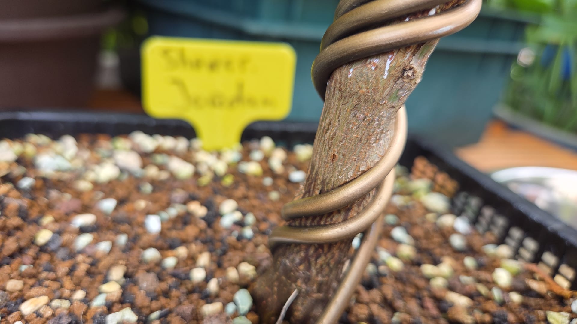 Om de Jordan tijdens het verpotten vast te zetten, hadden we een zogenaamd broekje gemaakt. De wortels zijn dan te dun om dmv ijzerdraad het boompje aan de pot vast te maken. Een dubbele draad wordt dan van onderuit in de pot gestoken en wordt om het stammetje van de boom gewikkeld om hem vast te houden. Dit draad was nu wat ingegroeid dus heb ik verwijderd. Een teken dat het boompje goed gegroeid is. Blijkt ook wel, want zonder het draad zat het boompje muurvast in de pot.