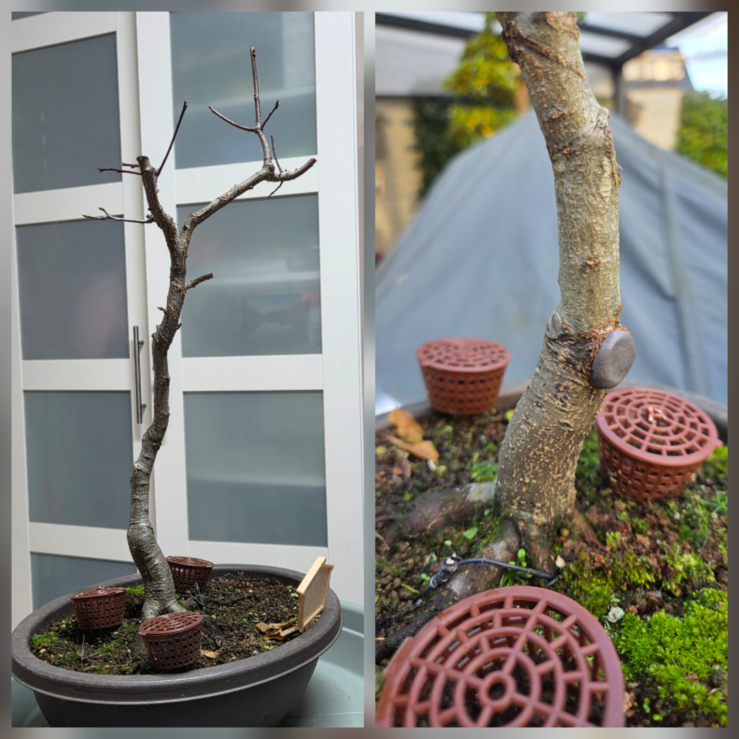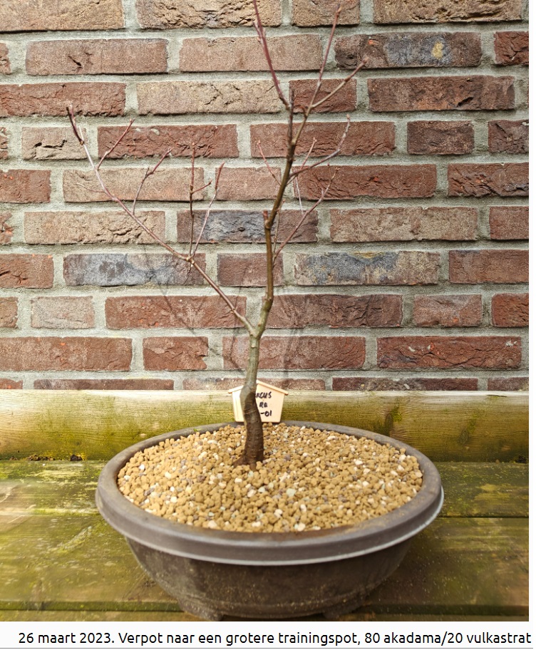 In 2023 was deze eik voor het laatst verpot. Afgelopen zomer merkte ik met watergeven dat het water slecht wegliep. Tijd om te verpotten.