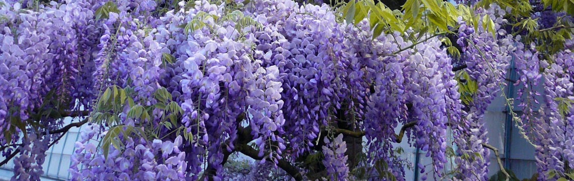 De Wisteria is een sterke, snelgroeiende en bladverliezende klimplant. In de lente produceert hij lange hangende clusters van blauw-paarse geurende bloemen.