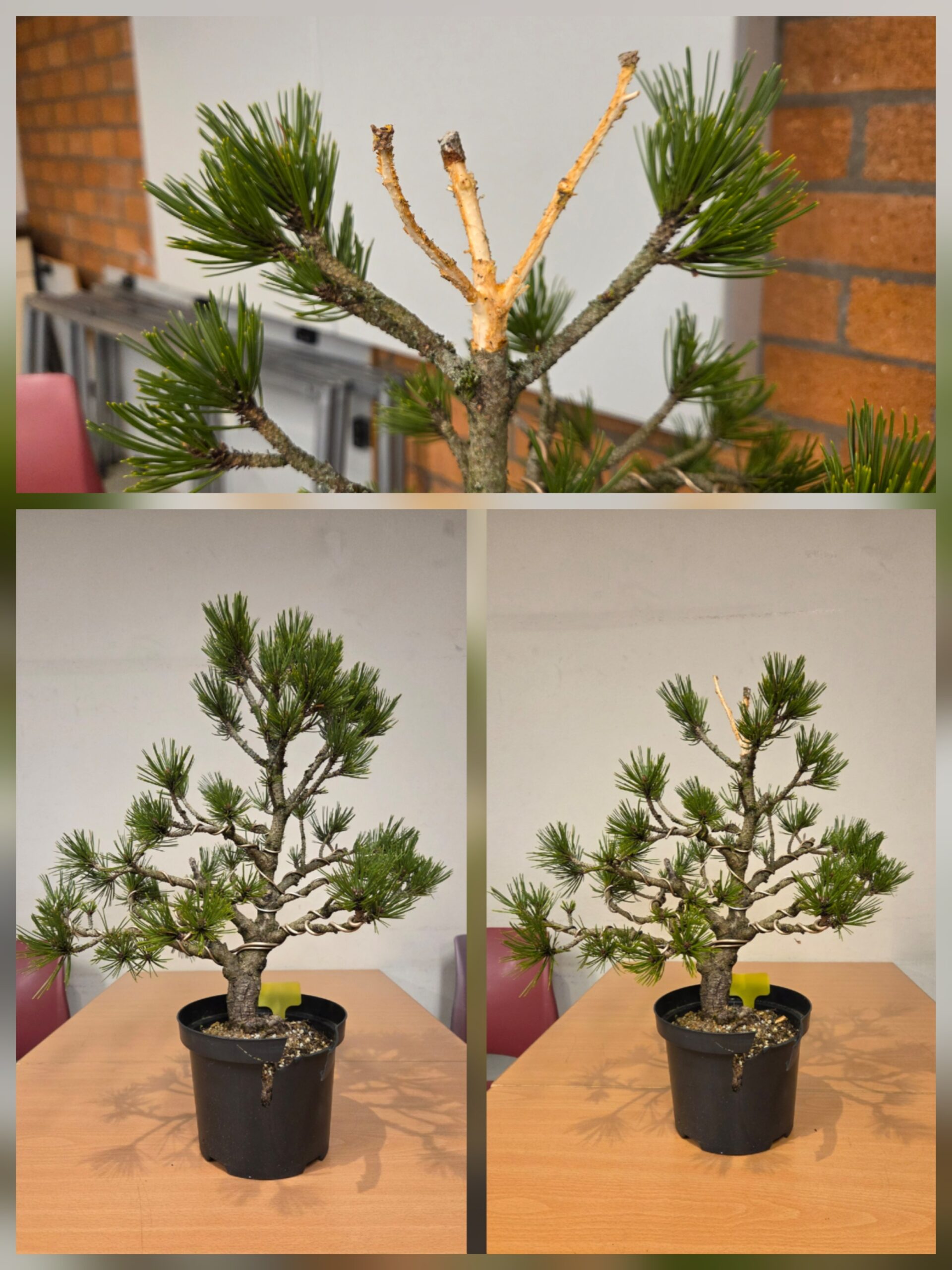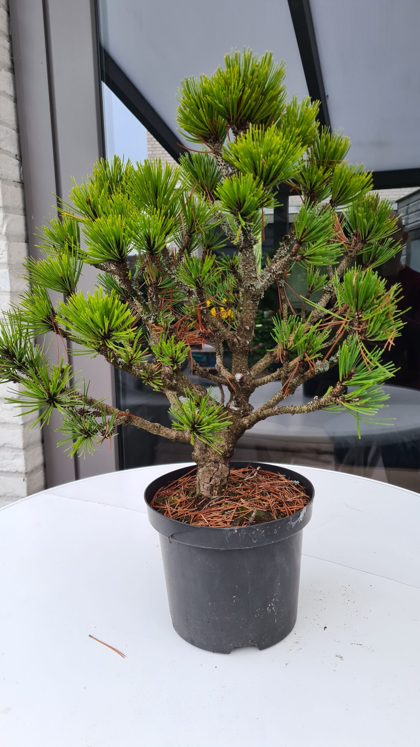 Ik ben niet helemaal tevreden met de positie in de pot. Iets te ver voorovergebogen, iets te ver naar links en iets te diep in de pot. Voor nu laat ik het maar zo. Over 2 jaar maar opnieuw doen. Wellicht is de vorm dan al weer wat verandert na toekomstige snoeiverbeteringen.