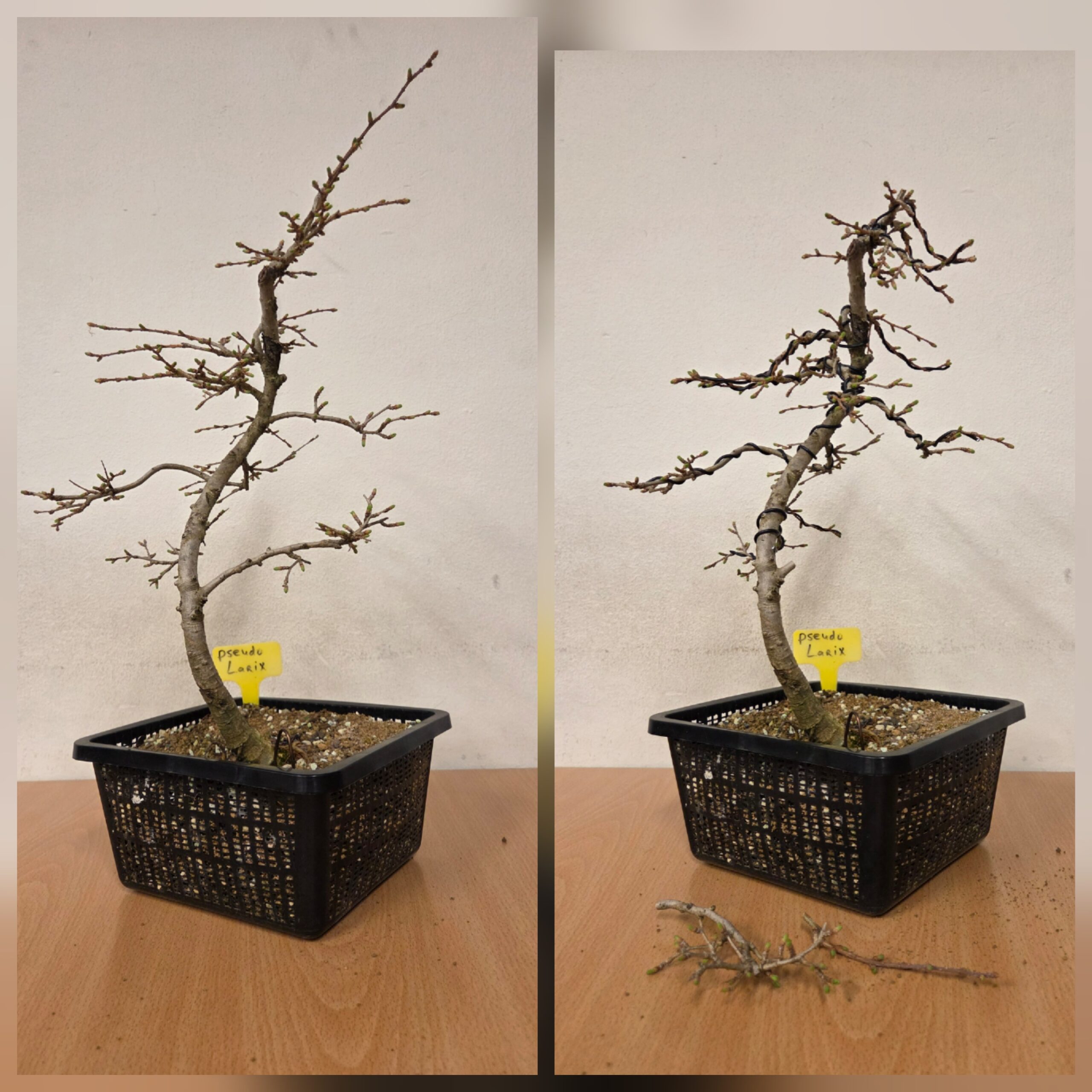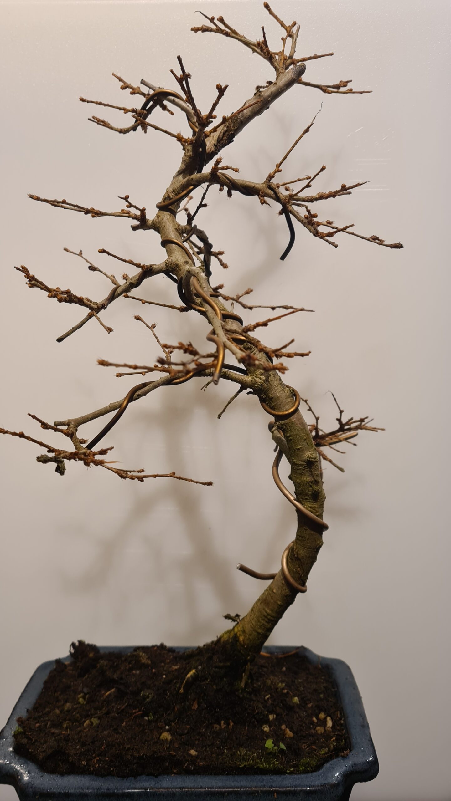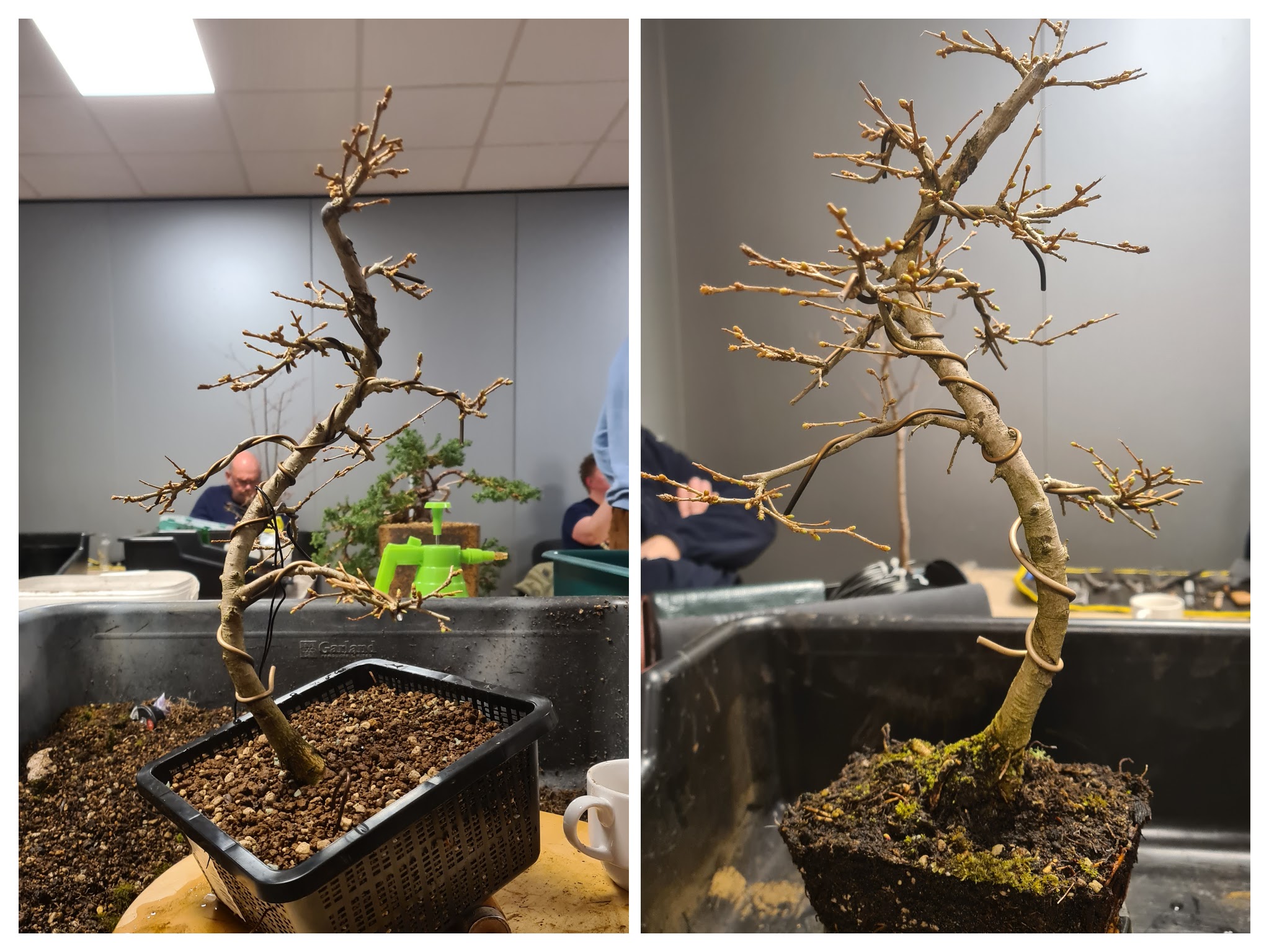 Tijdens de werkavond bij Bonsaivereniging Rijnmond de Larix, met hulp van Mike, verpot en de wintersnoei gegeven. De wortels groeien helaas maar aan 1 zijde van het boompje. Omdat de wortels er dun waren en geen houvast boden, een ijzerdraadje naar halverwege de boom vastgemaakt en aan de zijkant van het vijvermandje gezekerd.